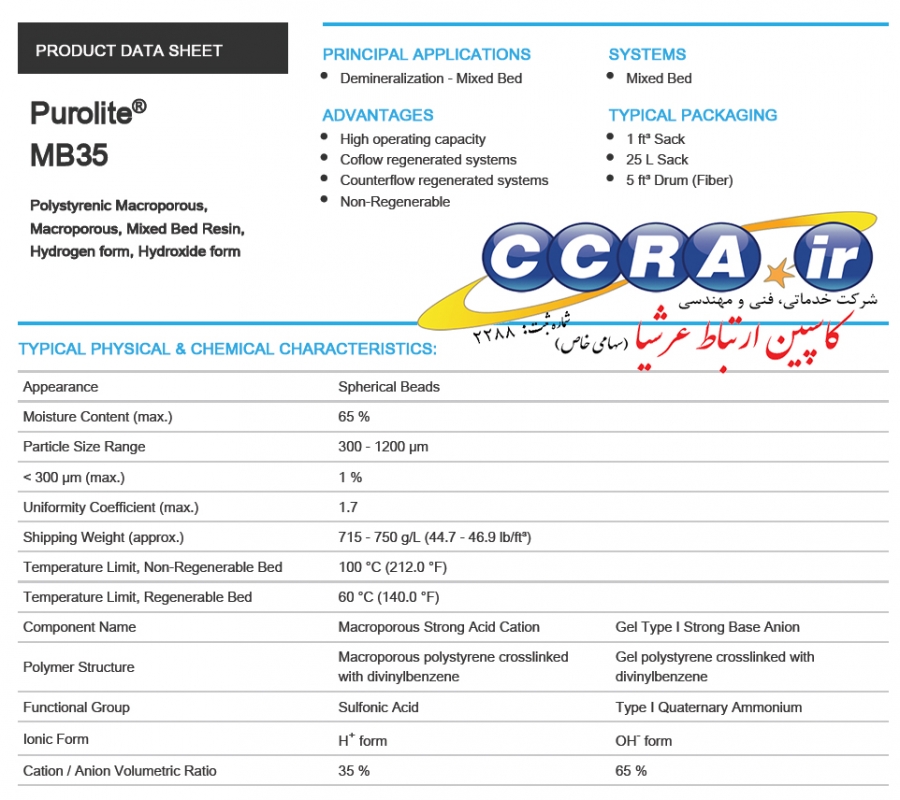 شرکت کاسپین ارتباط عرشیا کمپانی CCRA عرضه کننده انواع رزین های تبادل یونی با برند PUROLITE در ایران می باشد. این شرکت با ارائه بیش از 28 مدل از انواع رزین های تبادل یونی در مصارف مختلف به عنوان برجسته ترین کمپانی درایران است. یکی از مدل ها پرولایت مدل MB35می باشد که در مصارف صنعتی برای حذف سختی از آب می باشد.